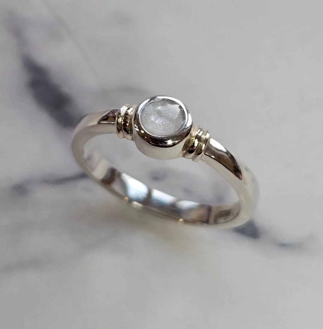 As Silver & Gold are precious metals, it works well if choosing to have a loved ones ashes, hair, fabric, fur or even breast milk set within your resin piece of jewellery, but this is not compulsory.